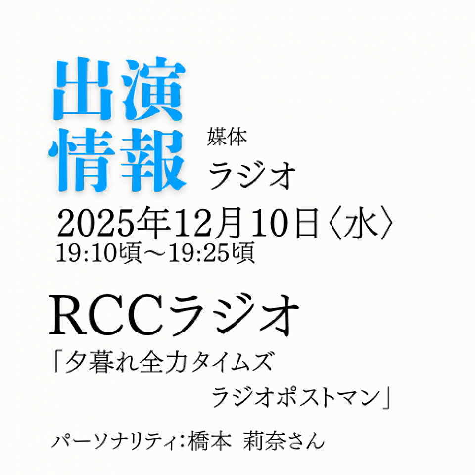 日時は2025年12月10日(水)の19時10分頃からスタートの約15分。RCCアナウンサーの橋本莉奈さんと共にお届けします。