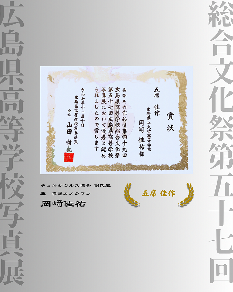 当会副代表で、専属カメラマンとして在籍する岡﨑佳祐が、第49回広島県高等学校総合文化祭の第57回広島県高等学校写真展にて、5席(佳作)を受賞いたしました!